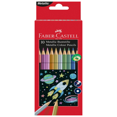 Colouring Pencils Faber-Castell Metallic Colouring Pencils Add to Cart View Cart Checkout Short Description: Product Description £ 6.99 Faber-Castell Color pencils metallic hexagonal box of 10 classic wooden barrel pencils: the colored pencils in a standard size and hexagonal shape. They feature vivid colors and a special bonding process to make them break resistant.
