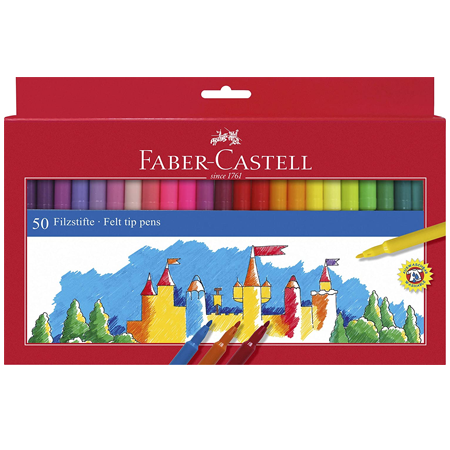 Colouring Pens Faber-Castell Pens (50) Colouring Pens Add to Cart View Cart Checkout Short Description: Product Description £ 14.99 Pack of 50 high quality fibre-tipped pens from Faber-Castell. Patented grip zone for a secure, non-slip grip. Ergonomic triangular shape.Washes out of most fabrics.